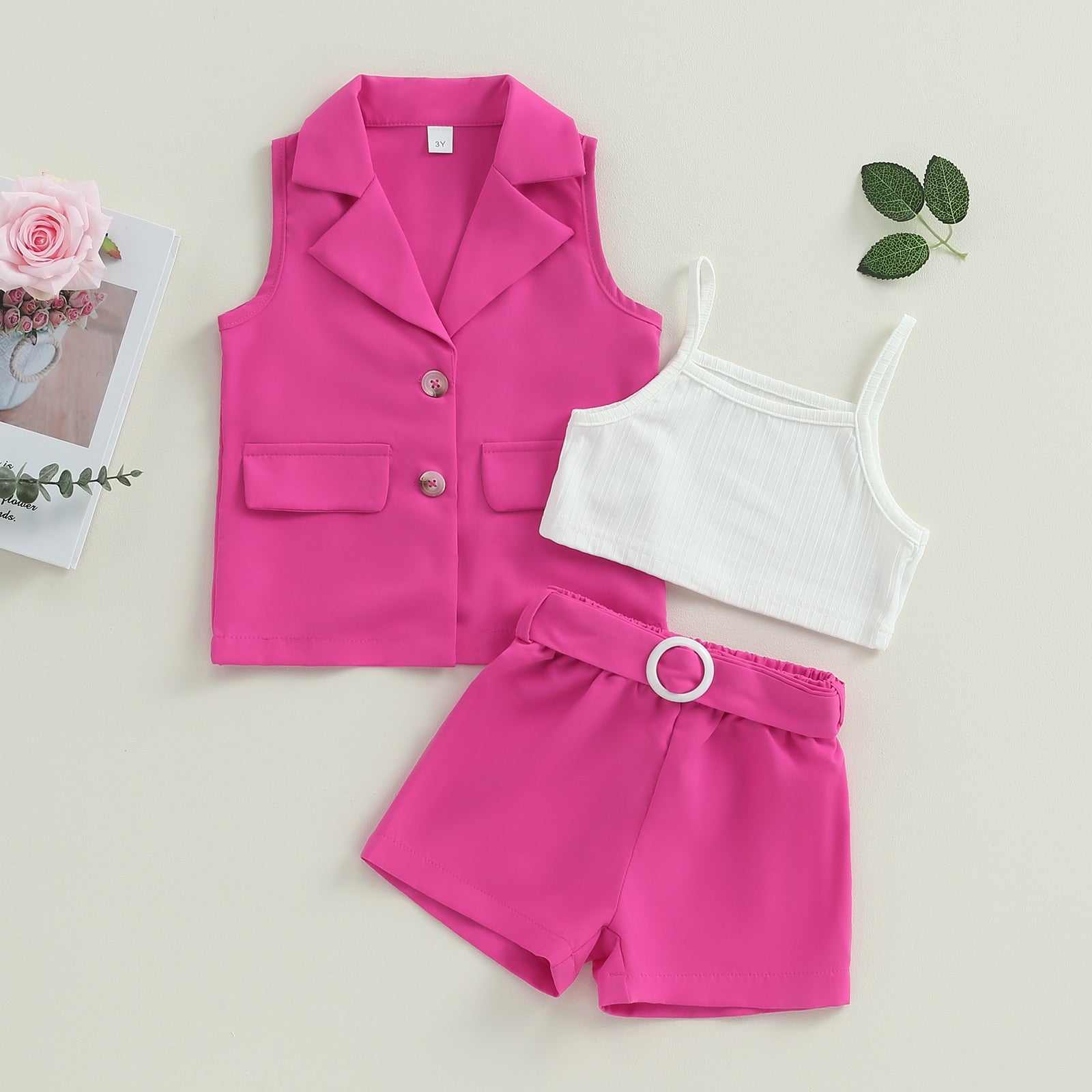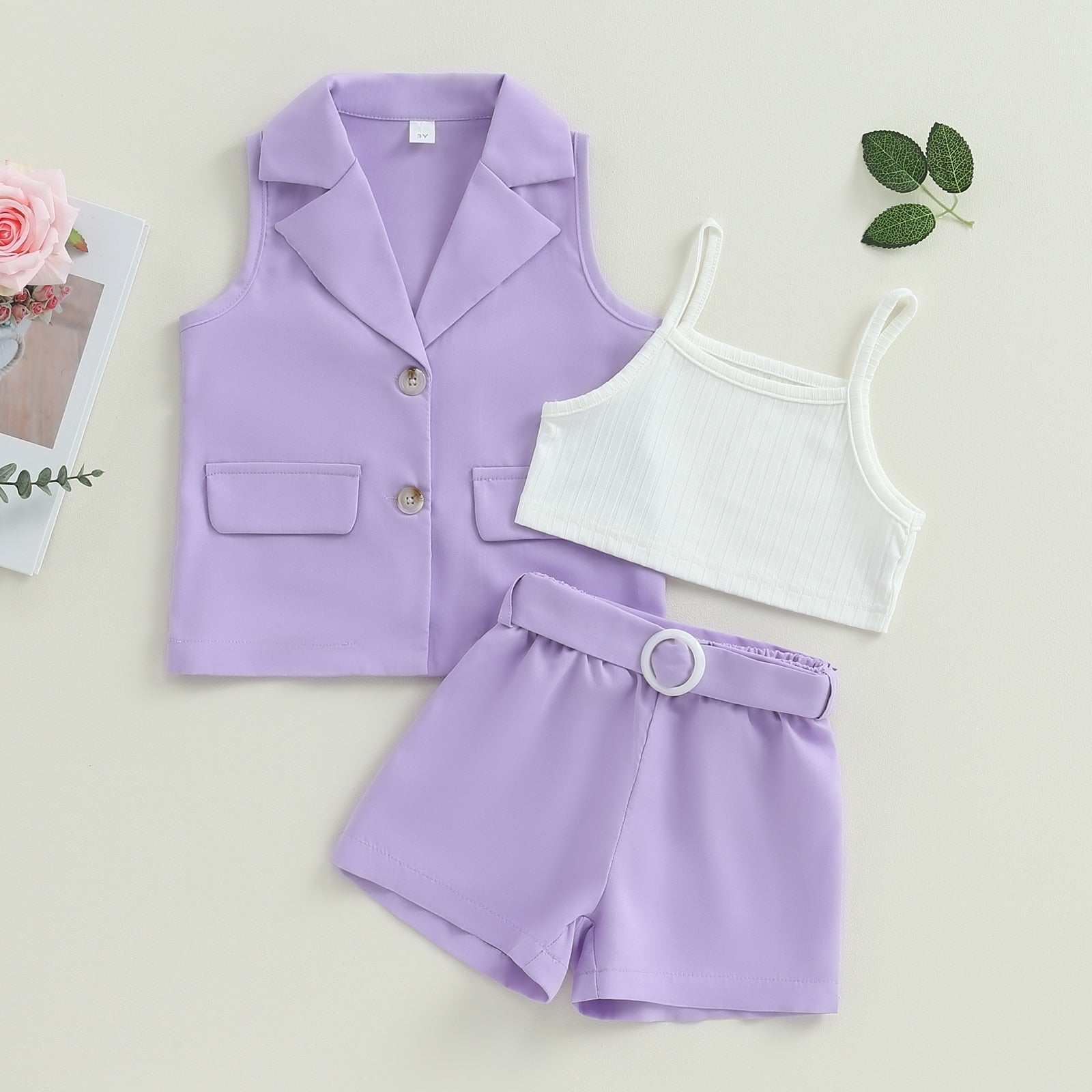 Conjuntos de verano de 3 piezas: blazer + tops tipo camisola + pantalones cortos con cinturón 2-7T