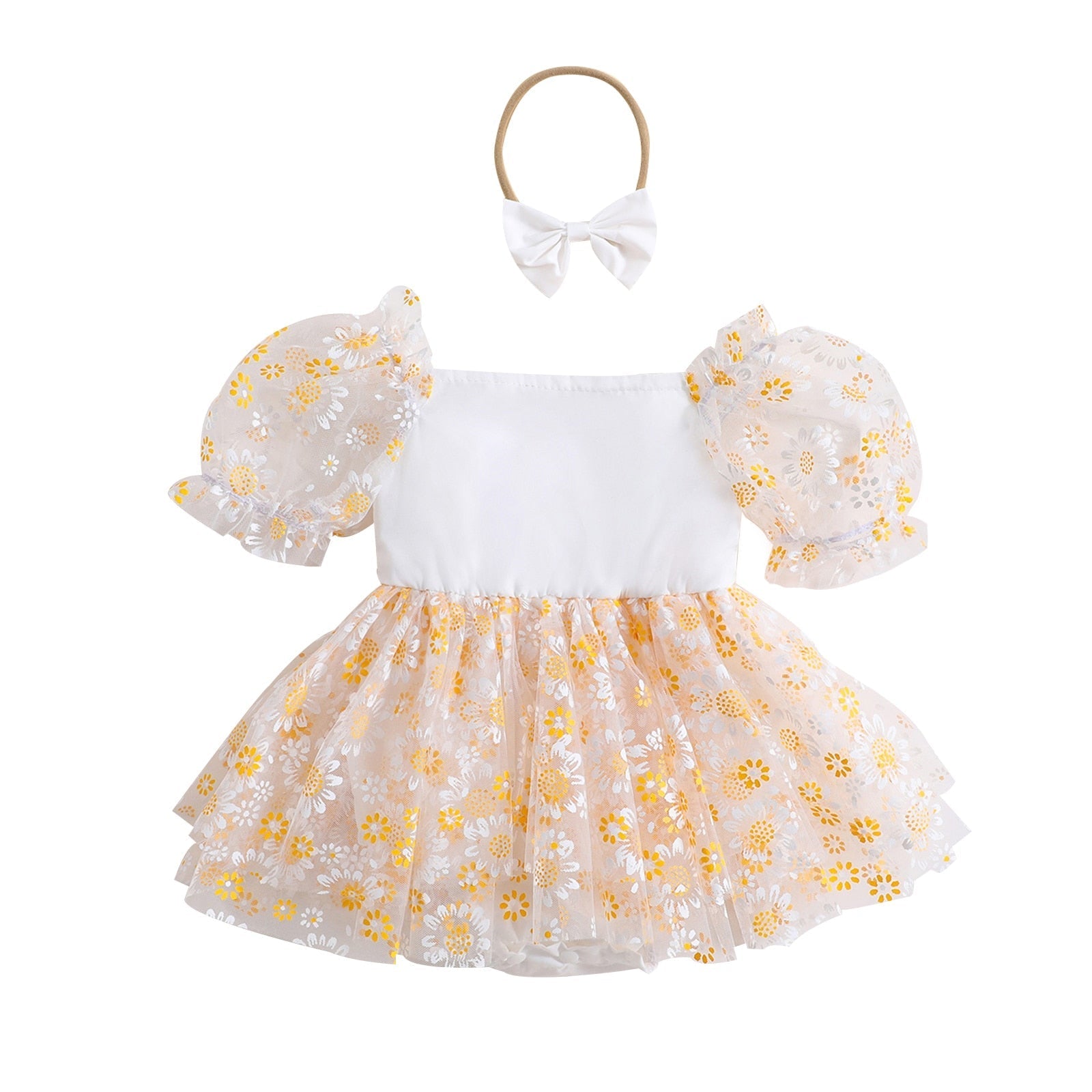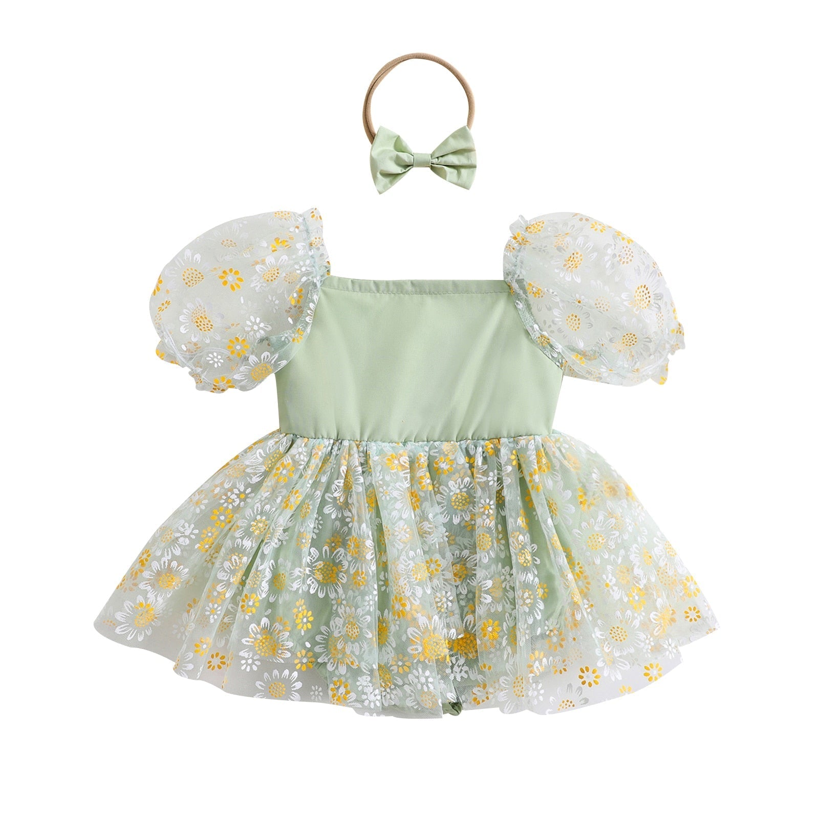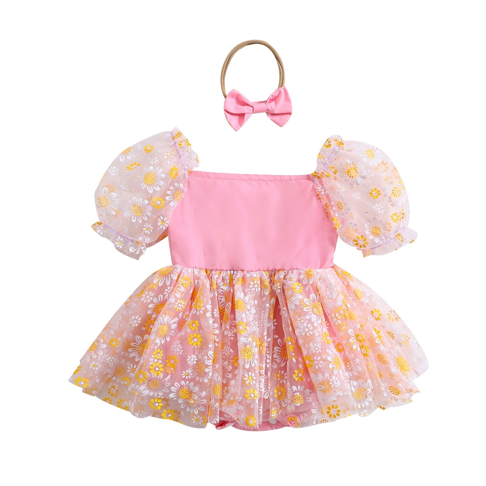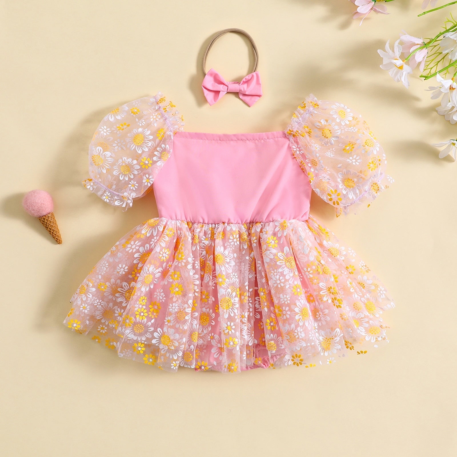 Vestido mameluco con estampado de margaritas y manga corta abullonada