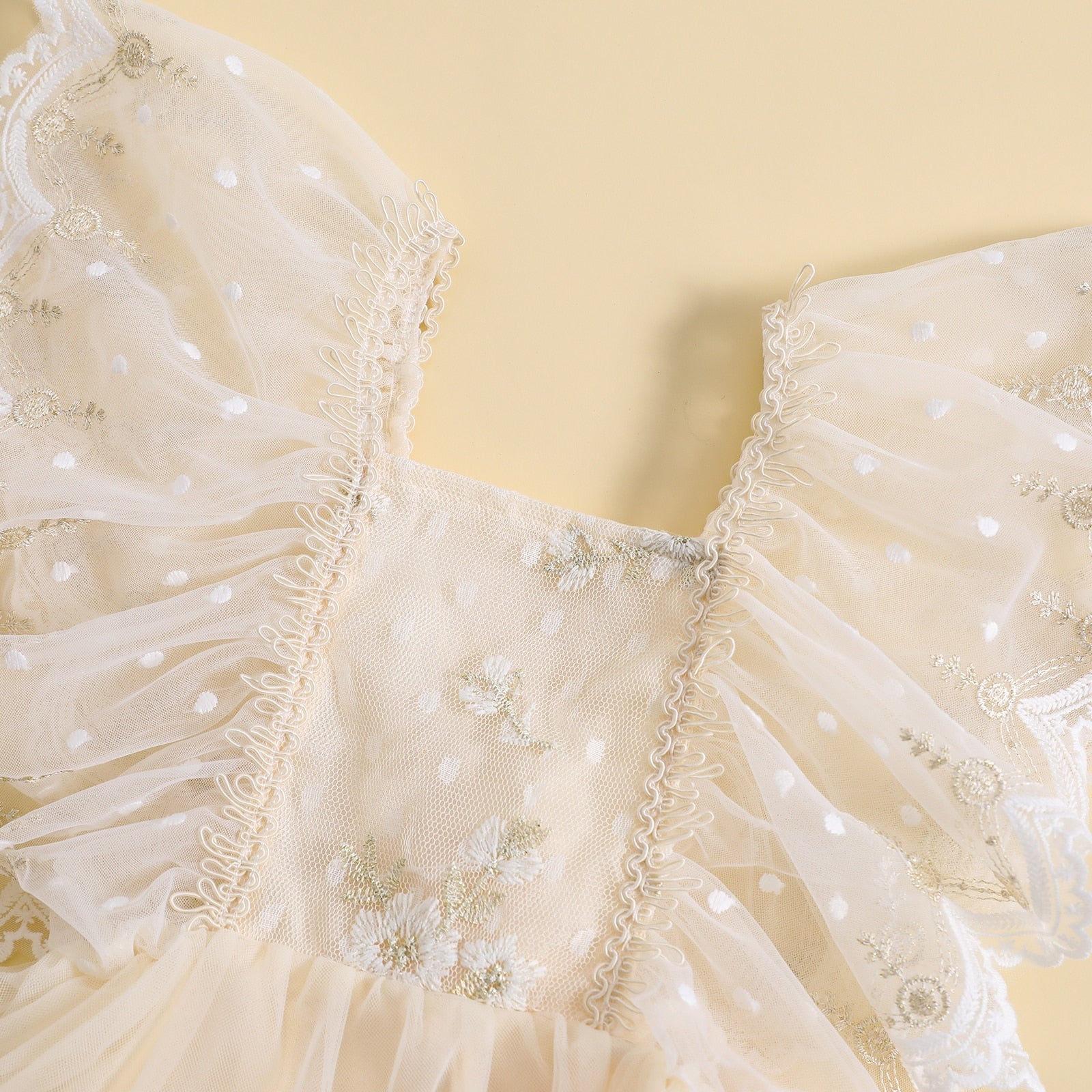 Vestido mameluco, tul con flores bordadas y mangas volantes