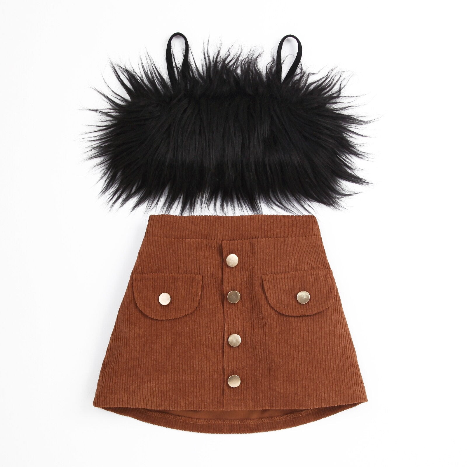 Conjunto camisola sin mangas de plumas + falda de pana acampanada con botones de cintura alta