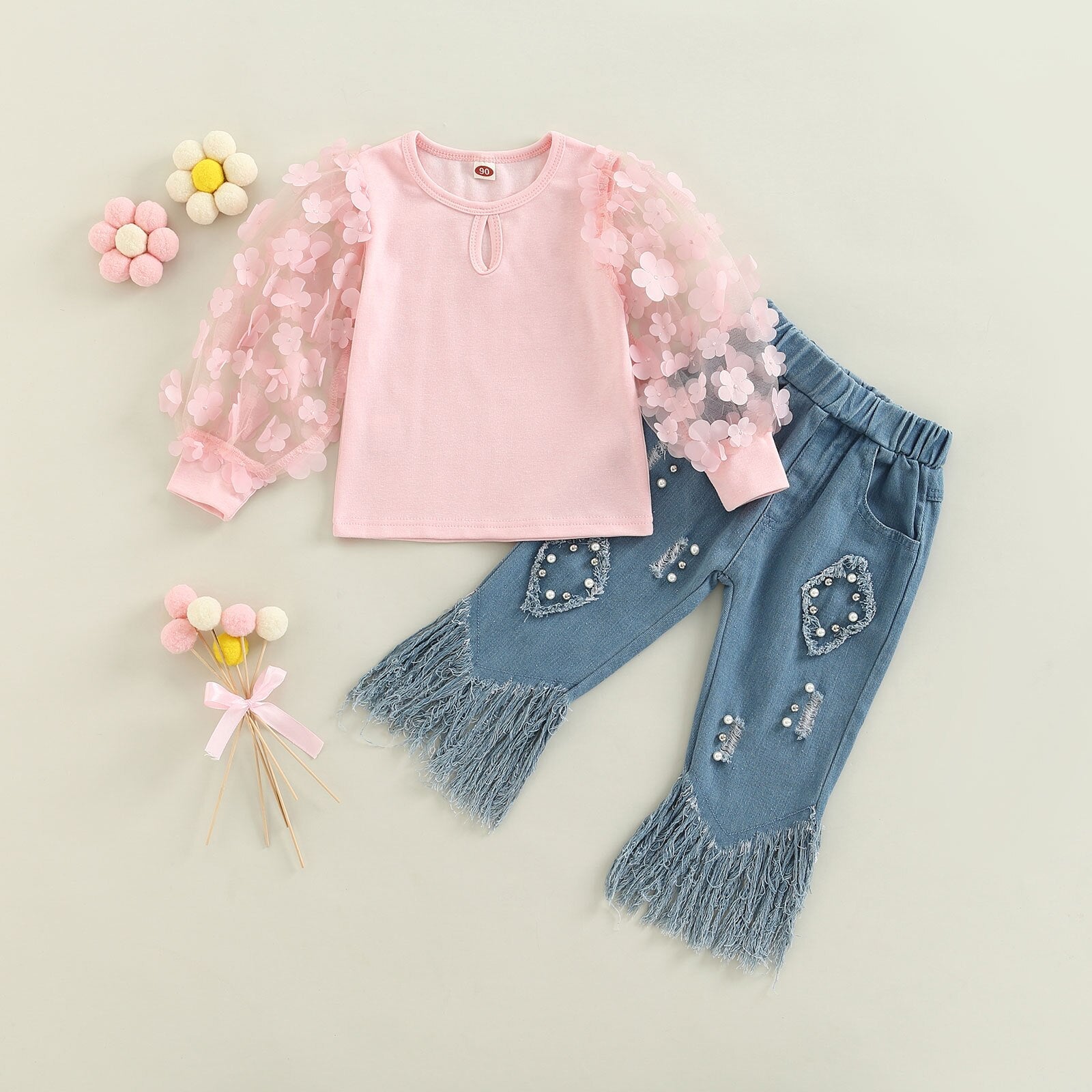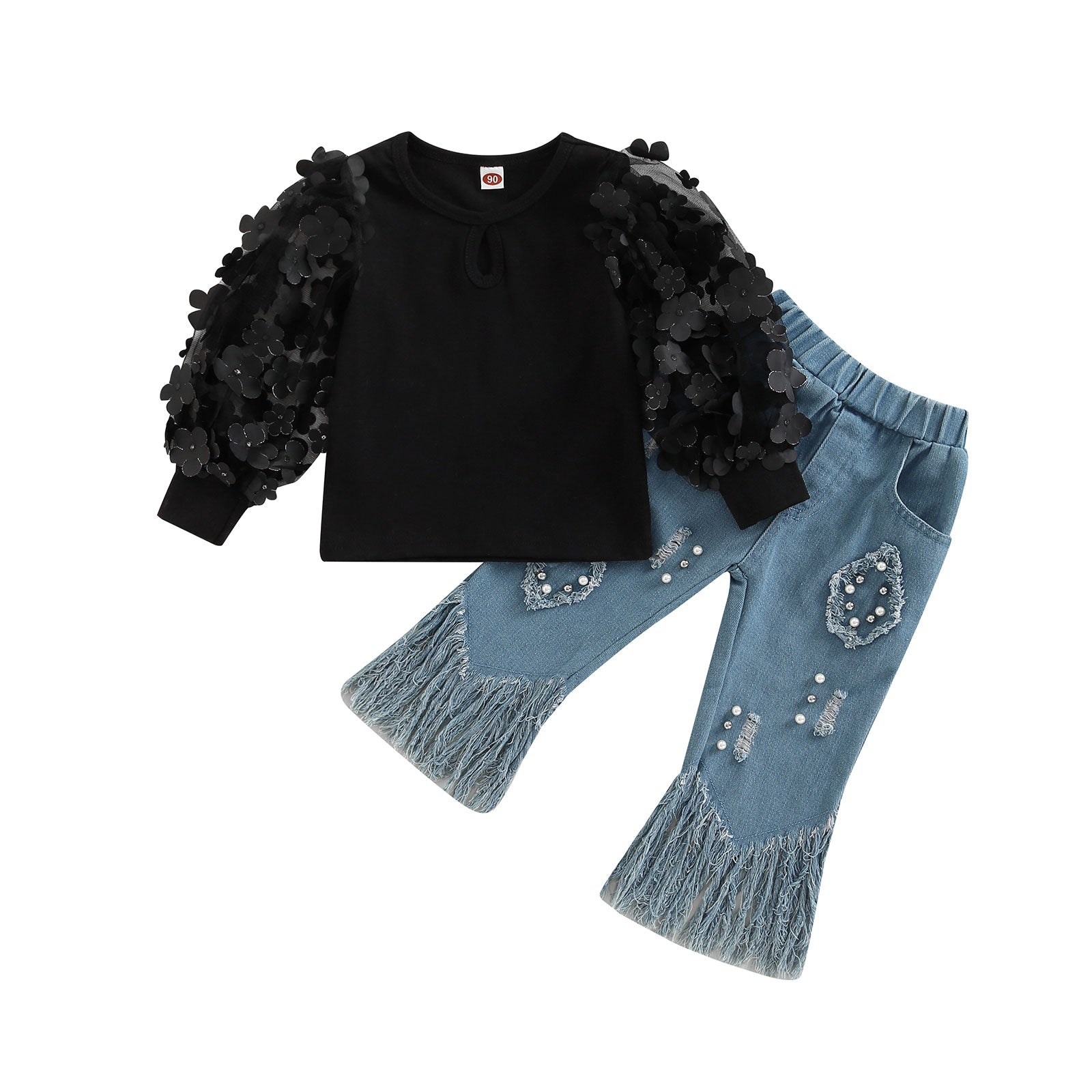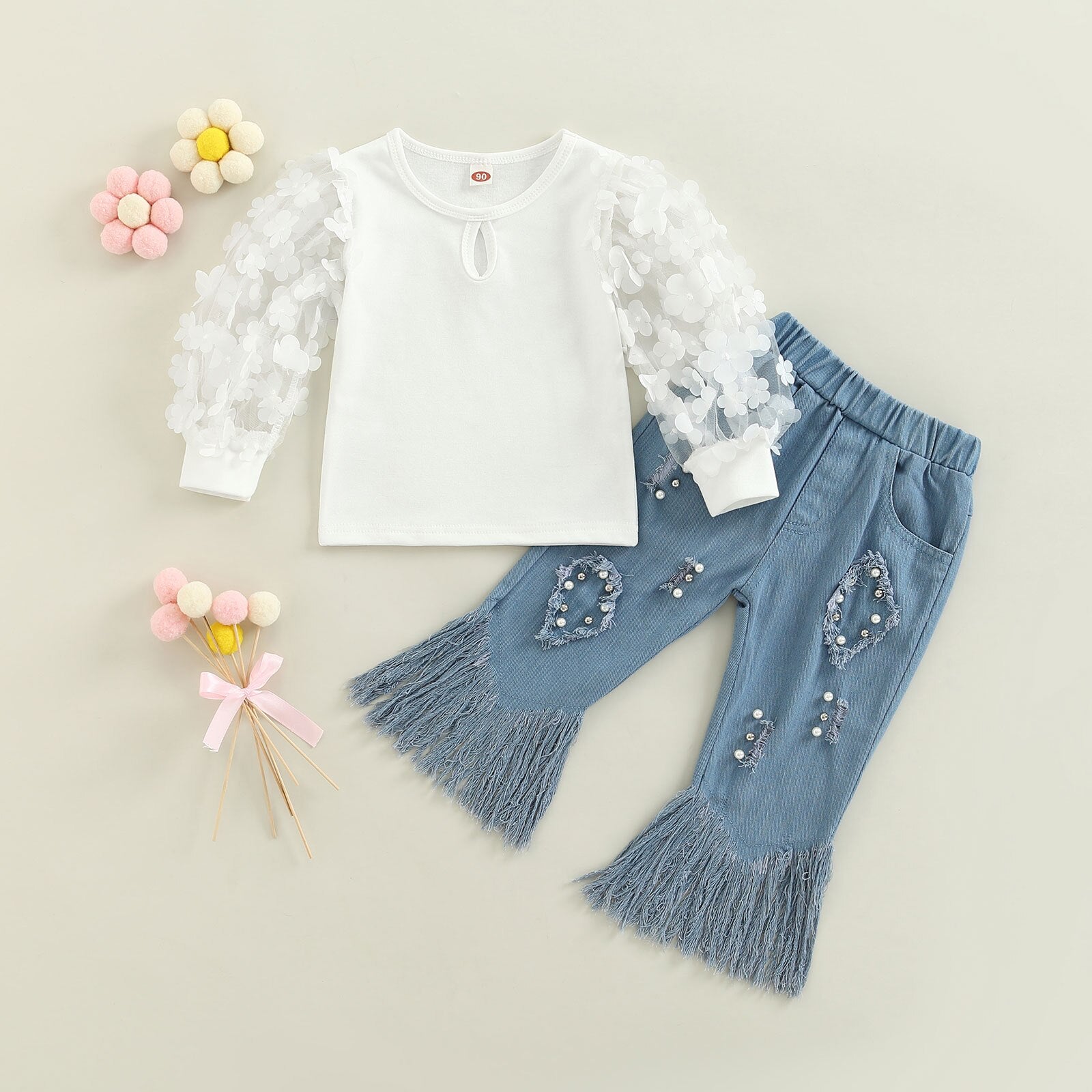 Conjunto de traje de primavera y otoño para niños pequeños, camisetas de malla de manga larga, camisa + pantalones acampanados con borlas de mezclilla
